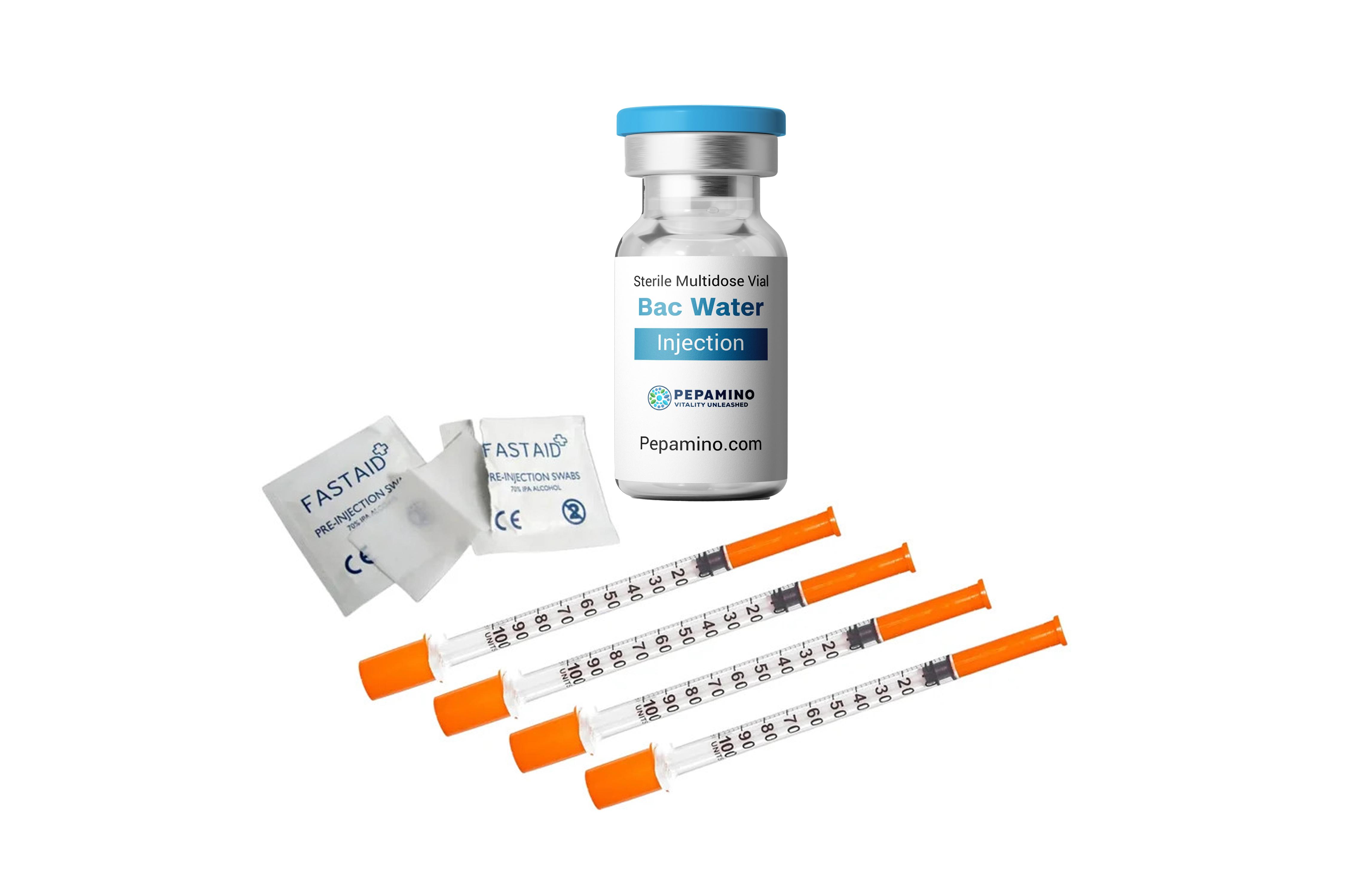 1 – 10 ml Bacteriostatic Water, 10 – 1ml insulin syringe with needle, 4 – 1 time use Alcohol pads